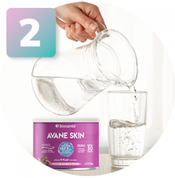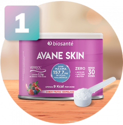 Adicione 1 medida do Avane Skin sabor frutas vermelhas em um copo com água ou bebida de sua preferência.